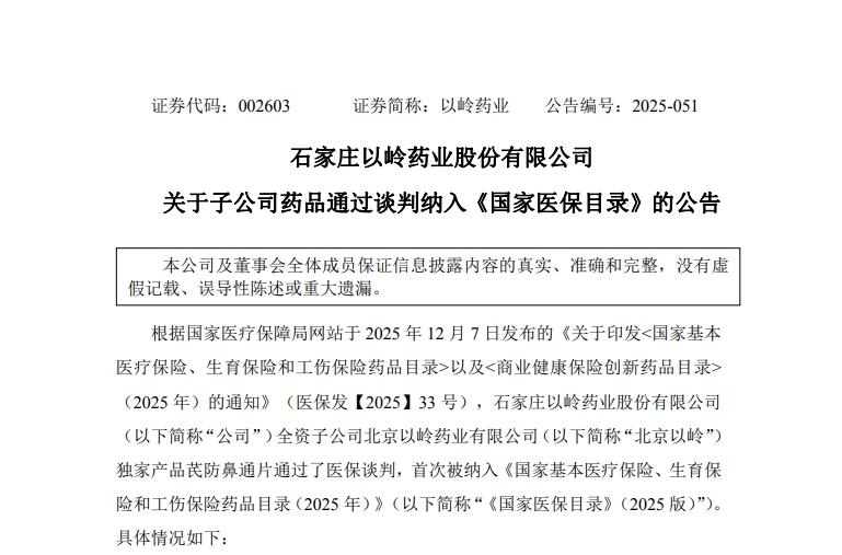 12月7日,以岭药业(002603.SZ)发布公告称,根据国家医疗保障局网站发布的《关于印发〈国家基本医疗保险、生育保险和工伤保险药品目录〉以及〈商业健康保险创新药品目录〉(2025年)的通知》,其独家产品芪防鼻通片通过医保谈判,首次被纳入国家医保目录。据悉,芪防鼻通片为首个说明书明确治疗持续性变应性鼻炎(即过敏性鼻炎)的创新中药,填补临床用药空白。