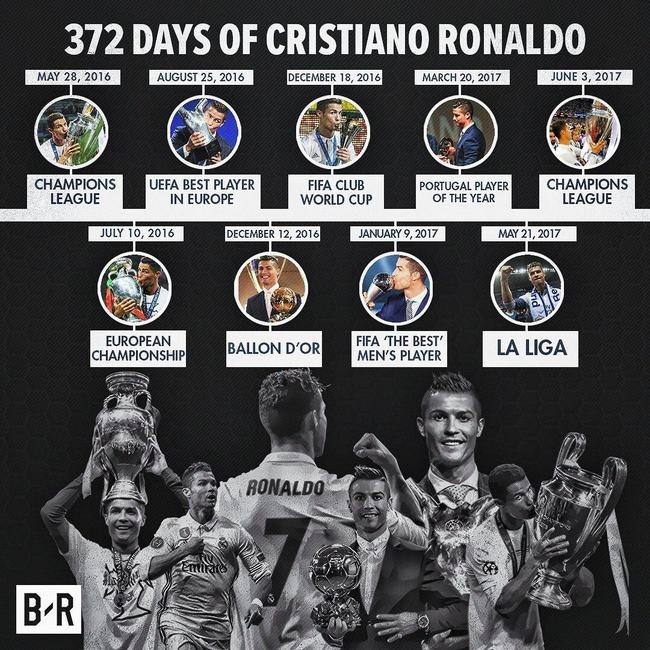 时间进入2017年,C罗的辉煌还在继续。在3月20日,C罗获得了葡萄牙足球先生,随后在今年的5月,C罗又帮助皇马时隔5年重夺西甲联赛冠军,而6月4日的欧冠赛场,C罗又用两粒进球帮助皇马问鼎。在过去这372天时间里,C罗总共拿到了西甲冠军、欧冠冠军(2座)、欧冠金靴(2座)、欧洲杯冠军、欧洲最佳球员、金球奖、世界足球先生这9座极其有分量的奖杯。
