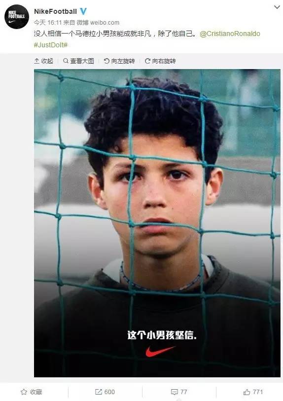 NIKE是C罗最重要的赞助商,每年给予皇马球星的代言费高达1816万美元,在皇马击败尤文登顶欧冠后,NikeFootball官微发布微博“没人相信一个马德拉小男孩能成就非凡,除了他自己。@CristianoRonaldo #JustDoIt#”。