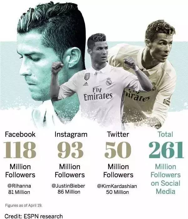在美国ESPN2017版的世界上最出名的100名运动员名单中, C罗高居第一。除了独占本次榜单榜首外,帮助皇马五年后再夺西甲冠军,实现欧冠卫冕的C罗还以2亿6100万粉丝排名社交媒体关注总数第一位。这名4夺金球奖的皇马巨星是Facebook最受关注的用户,拥有1亿1180万名粉丝;他在Facebook、Twitter、Instagram总共拥有超过2亿6100万粉丝,单单在2016年他的粉丝数就增加了6500万。
