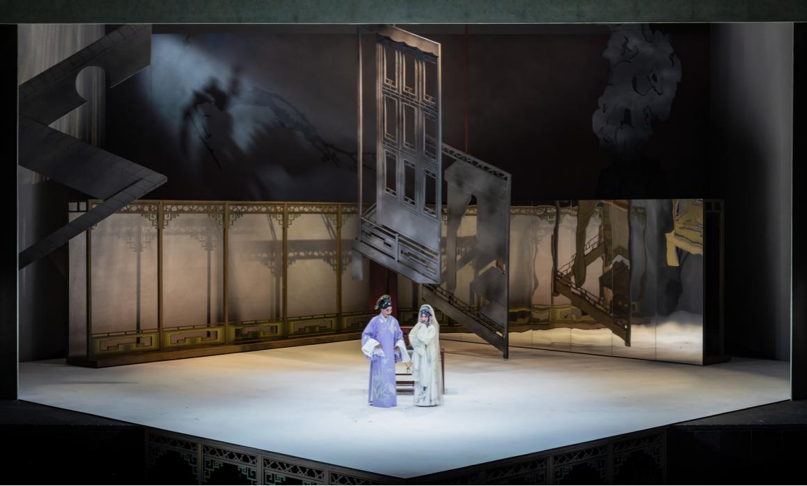 巨幅镜面铺展,亭台楼阁与断井颓垣在折叠的园林中交错,杜丽娘的水袖轻扬,跨越四百年的生死情缘在合肥大剧院的舞台上“还魂”。