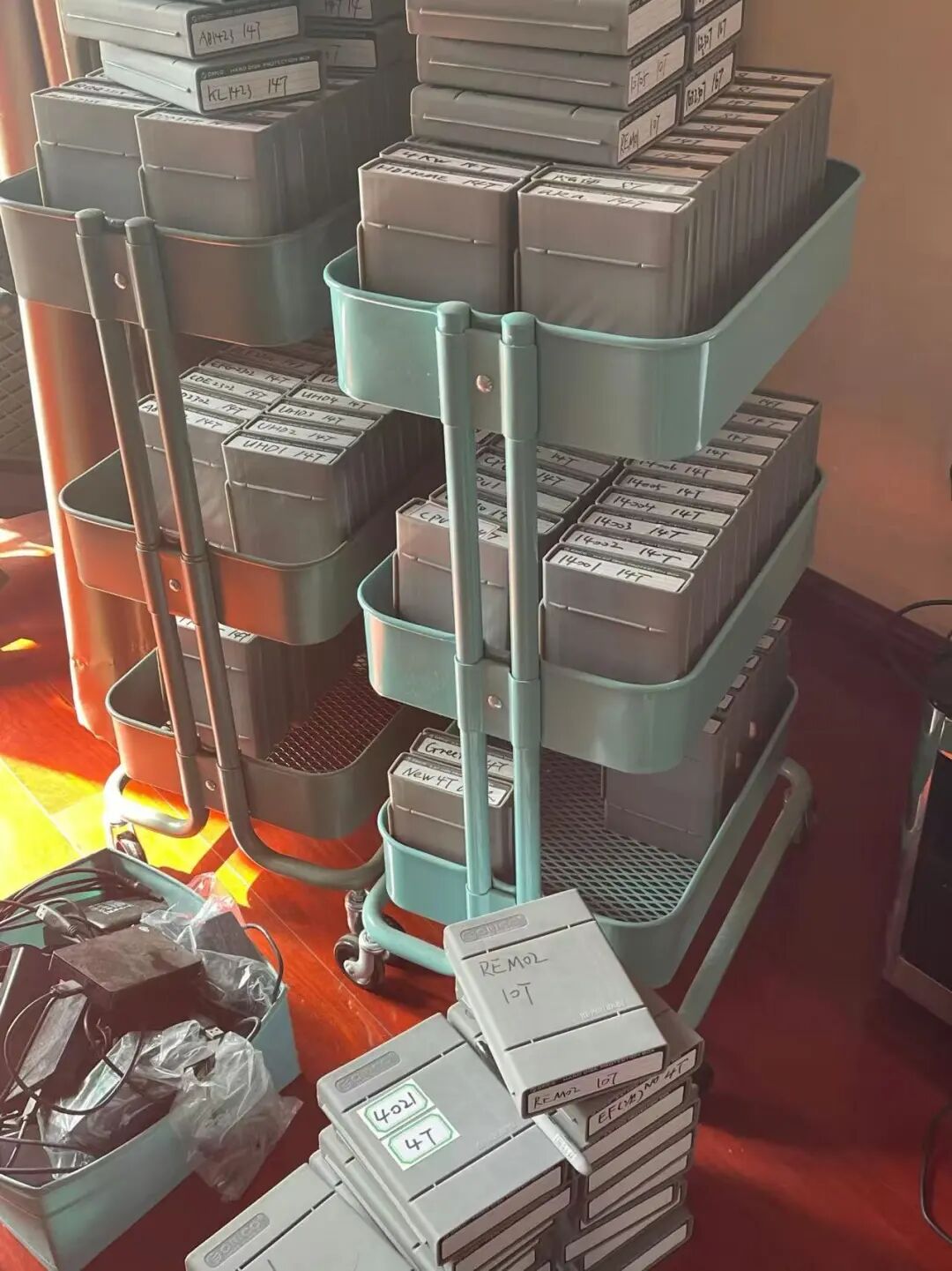 要存储数量如此可观的电影,元朗主要靠自己囤的100多块移动硬盘。这些硬盘容量在8T到16T之间,整齐地收纳在家中三台专门装硬盘的小推车里。