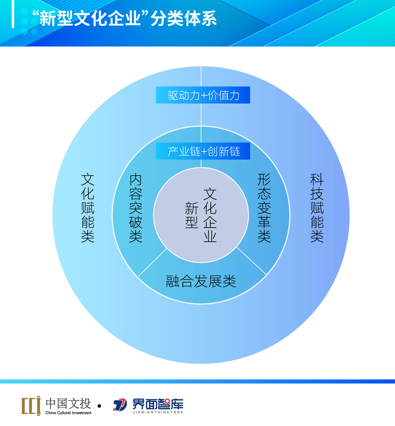 从“产业链+创新链”视角,本次研究将“新型文化企业”分为“内容突破类”、“形态变革类”和“融合发展类”三个主要类型,这一分类既体现了“投入—过程—产出”的产业全链条逻辑,又精准对应了“产品创新—流程创新—要素创新”的三维创新框架;从“驱动力+价值力”视角,本次研究将“新型文化企业”分为“科技赋能类”和“文化赋能类”两个主要类型。两个视角相互补充,共同形成 “3+2”新型文化企业分类体系。其中,“产业链+创新链”视角强调 企业“创新发生在何处”,而“驱动力+价值力”视角则回答“创新由何驱动、创造何种价值”。