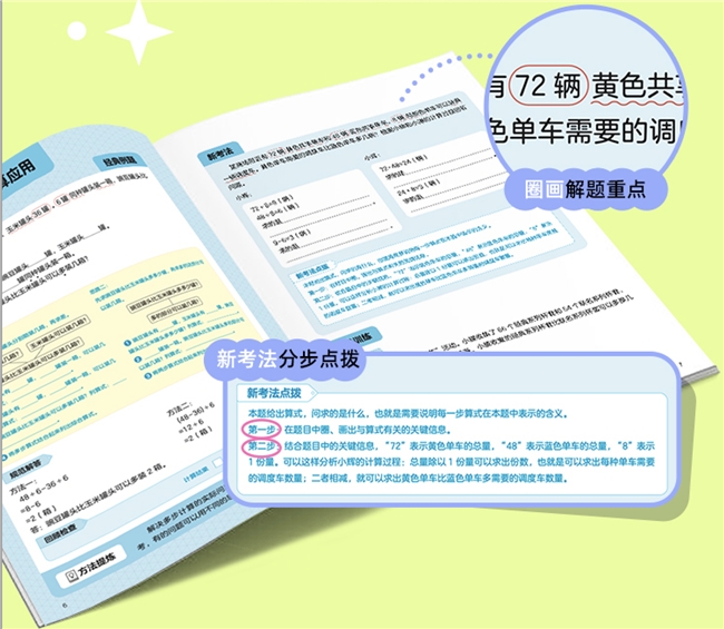 《应用题新题新解》在解题指导方面,为典型题目精心设置了“阅读理解→图解分析→规范解答→回顾检查”的四步法,逐步引导学生从抓取信息、直观理解到规范书写与自我反思,同时通过“方法提炼”模块点拨,提升学生的解题与归纳总结能力。此外,该书的实用性也尤为突出,清晰的目录便于快速检索,详尽的答案提供步步解析,加之大量图解法、列式法等可视化工具的运用,旨在成为学生高效自学、家长轻松辅导的得力助手。