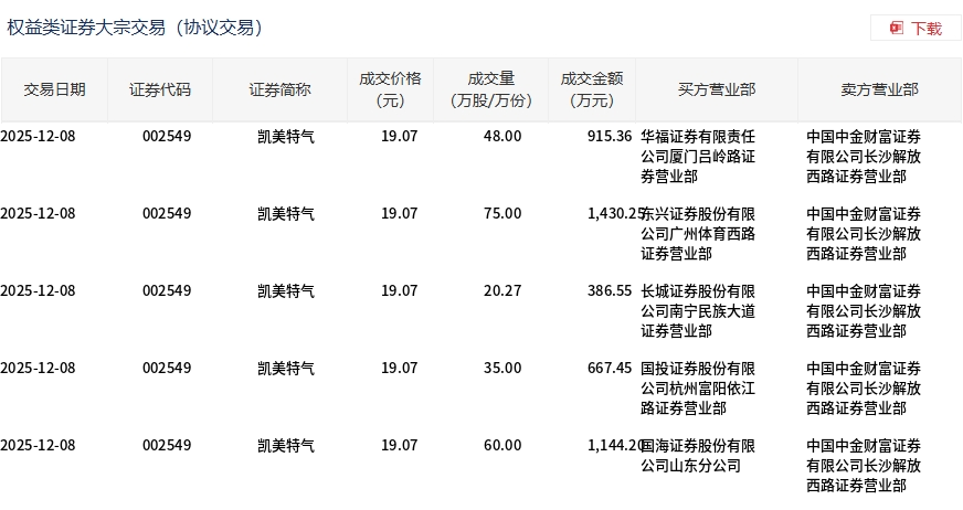 12月8日,凯美特气大宗交易成交238.27万股,成交额4543.81万元,占当日总成交额的4.94%,成交价19.07元,较市场收盘价20.51元折价7.02%。