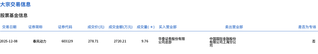 12月8日,春风动力大宗交易成交9.76万股,成交额2720.21万元,占当日总成交额的7.76%,成交价278.71元,较市场收盘价278.71元持平。