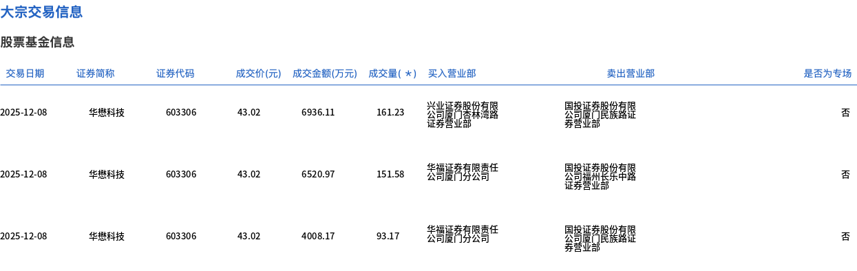 12月8日,华懋科技大宗交易成交405.98万股,成交额1.75亿元,占当日总成交额的19.51%,成交价43.02元,较市场收盘价50.34元折价14.54%。