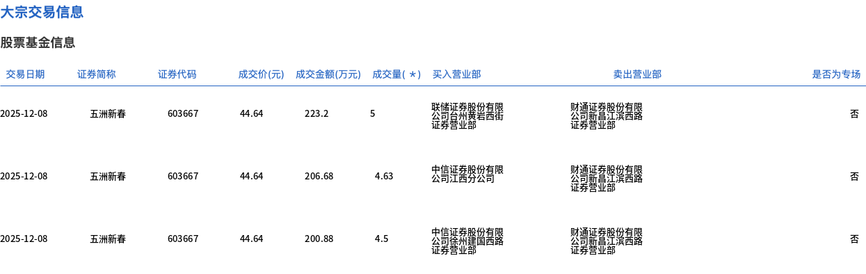 12月8日,五洲新春大宗交易成交117.53万股,成交额5246.54万元,占当日总成交额的1.63%,成交价44.64元,较市场收盘价53.97元折价17.29%。