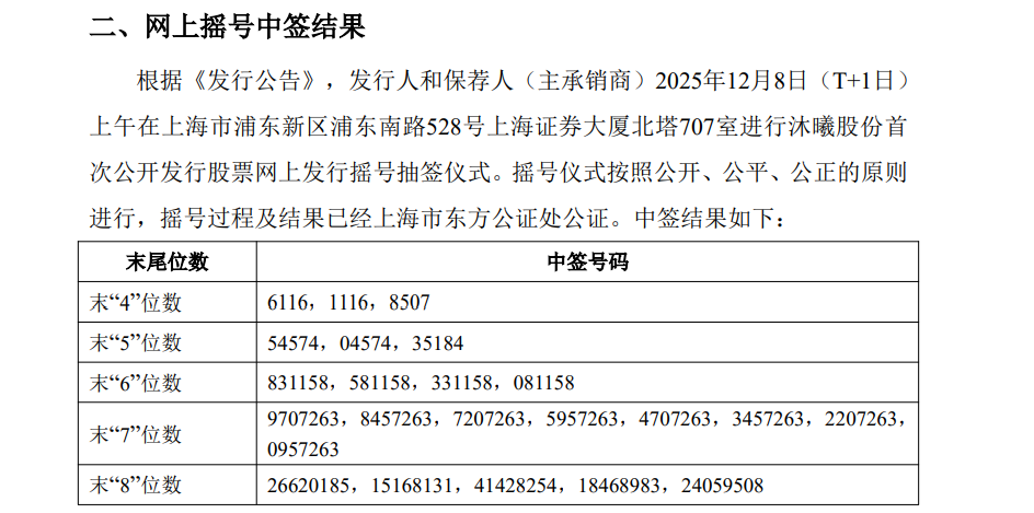 沐曦股份12月8日公告,凡参与网上发行申购沐曦股份A股股票的投资者持有的申购配号尾数与上述号码相同的,则为中签号码。中签号码共有19,331个,每个中签号码只能认购500股沐曦股份A股股票。