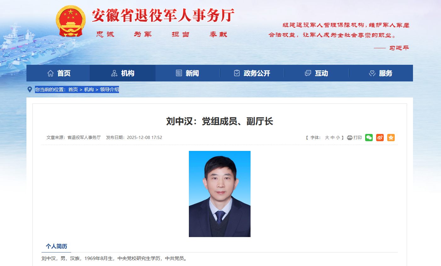 据安徽省退役军人事务厅网站“领导介绍”一栏12月8日更新后显示,刘中汉已任安徽省退役军人事务厅党组成员、副厅长。