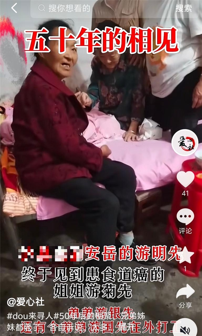 记者在抖音号@爱心社 看到,这里已有一百多条寻人视频,寻亲人来自全国各地。这些视频中,有孩子找父母的,有老人寻亲人的,也有寻到亲人后相拥而泣的团圆画面,其中就有游婆婆50年后回乡见到身患癌症的亲姐姐的画面,两位老人手拉手,感慨万千。