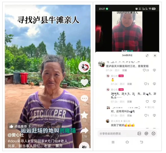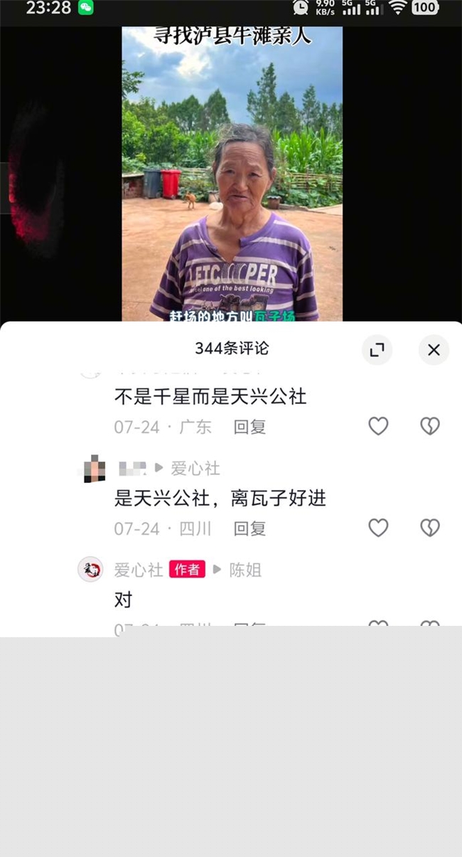 依据这些线索,初步判断婆婆来自四川泸县,此前所说的“牛毛滩”应为泸县的“牛滩”。7月24日,刘仁发通过抖音号@爱心社 发布了更详细的寻亲信息。评论区里,许多四川泸县网友积极反馈线索:“天兴火炮厂那边有姓游的”“玉峰,以前叫兴隆场”“那是天兴镇的”……网友的拼凑中,游婆婆的家乡愈发清晰起来。接着,一条信息精准的留言出现:“是泸县天兴镇龙凤村三社,是我堂姐。”跨越50年,游婆婆的消息终于顺着网线传递到了亲人面前。此时,距离视频发布不过两小时。