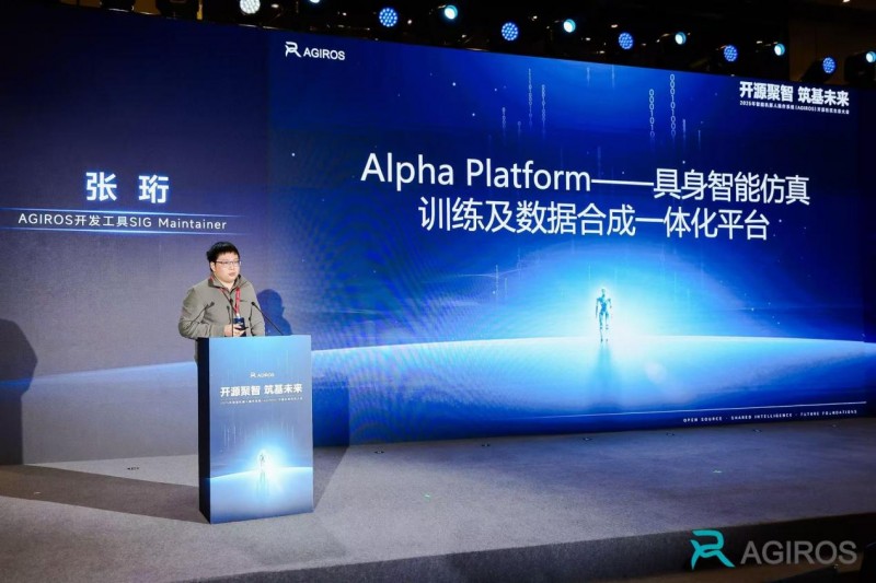 AGIROS开发工具SIG Maintainer张珩带来《Alpha Platform——多场景泛化的具身智能仿真与训练平台》的技术讲解。张珩提到Alpha Platform 的目标不是提高某一个模型的分数,而是让机器人真正学会在复杂世界中自主完成任务。仿真与现实的鸿沟正在被数据合成与具身训练重塑,这意味着机器人具备了面向千行百业的可迁移能力。