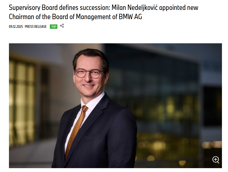 宝马监事会12月9日宣布,米兰·内德尔科维奇(Milan Nedeljković)将于2026年5月14日起正式就任宝马集团管理委员会主席,接替奥利弗·齐普策。
