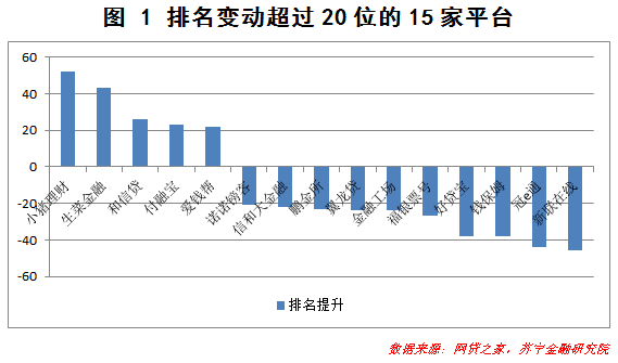 在这82家平台中,15家平台的名次变动超过20位,5家名次提升,10家名次下降,其中翼龙贷、鹏金所、信和大金融三家平台均属于在2016年12月排名行业前20的超级大平台。15家平台的名次变动位于10-20位之间;52家平台名次变动较小,在10位以内。