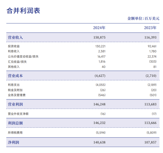 12月9日,中国投资有限责任公司(简称中投公司)发布经董事会批准的《2024年度报告》。《年报》显示,中投公司2024年实现净利润1406.38亿美元,同比增长30.39%;投资收益1302.21亿美元,同比增长40.84%。