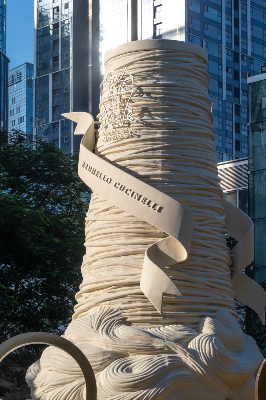 Brunello Cucinelli将冬日氛围直接搬到深圳湾万象城中央广场——高达十米的羊绒主题圣诞艺术装置作为核心视觉登场,以绒线与绒团构成立体“羊绒圣树”,顶部嵌入品牌标志性的狮鹫徽章,索罗梅奥小镇的人文意象被具象化为可进入、可观赏的城市装置。该冬日艺术装置将持续展出至2026年1月。