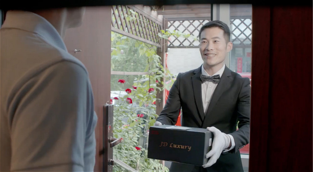 在6月5日发布的公告中,京东将之定义为由专业小哥提供的个性化快递服务,主要针对奢侈品购买。配套的一部广告片以腕表品牌泰格豪雅为例,主人公在京东旗舰店下单购买一块标价15999元的竞潜机械表后,就有打着领结的西服小哥驾驶京东专车,驶入一片别墅区,上门完成最后一公里配送。顾客拿到手的黑色包装盒侧面烫有“JD Luxury”(京东奢侈)的金色字样。