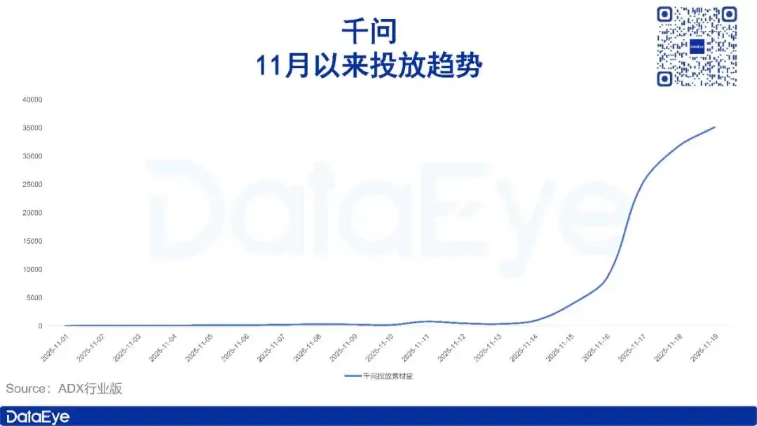 有阿里这一巨头依靠的千问,自然不畏惧流量之战。ADX行业版数据显示,11月以来千问(及前身通义APP)投放力度呈前期低迷、后期爆发状态。11月13日及之前,通义APP投放力度几乎停滞,日投放素材量仅有几十至上百组;11月14日,通义升级为千问APP,投放素材量随之上涨至890组,并在之后爆发式上涨。