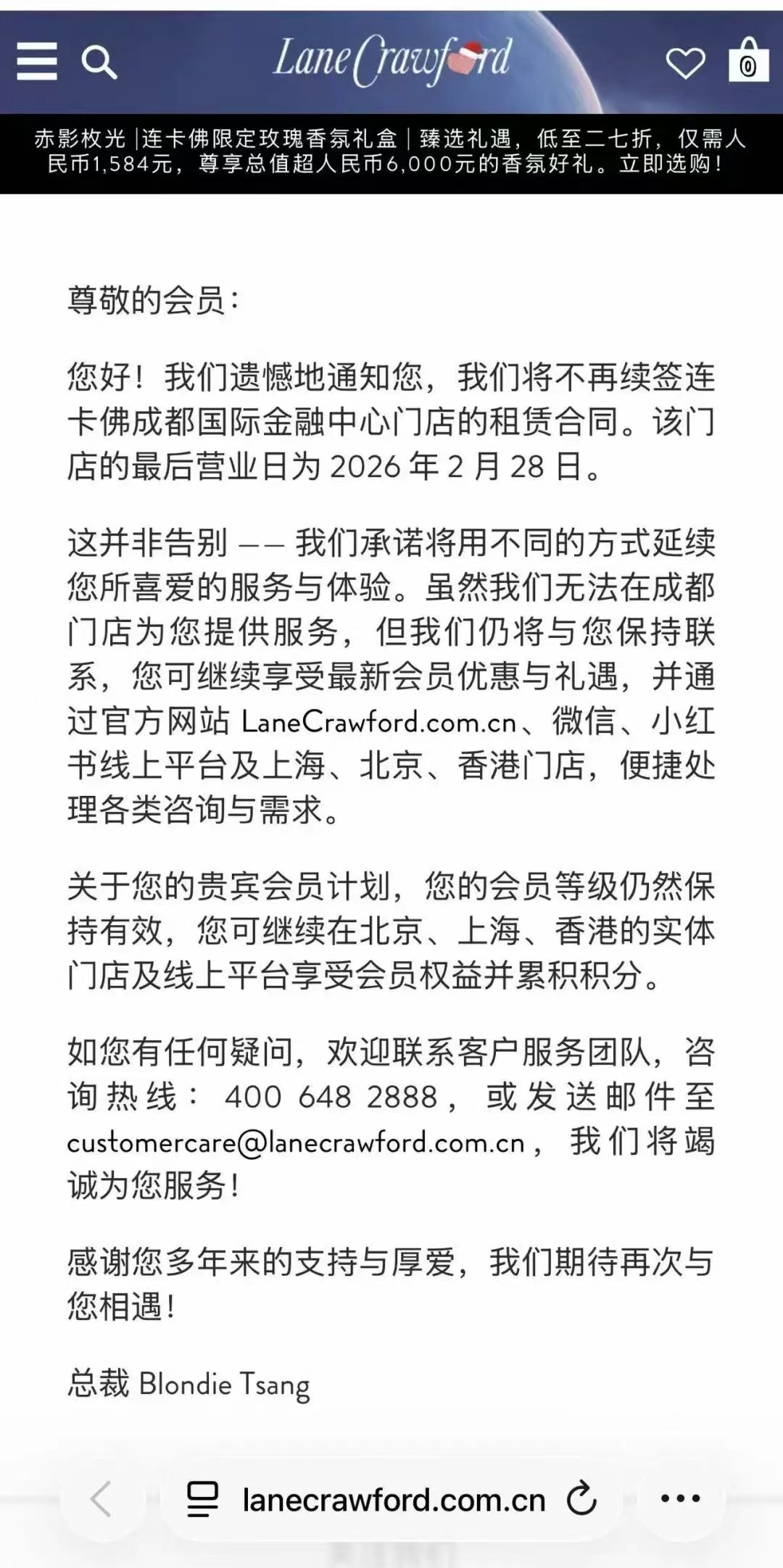 在通知中,连卡佛表示:“这并非告别,我们承诺将用不同的方式延续服务。虽然我们无法在成都门店为您提供服务,但我们仍将与您保持联系,您可继续享受最新会员优惠与礼遇,并通过官方网站、微信、小红书线上平台,以及上海、北京、香港门店,处理各类咨询与需求。”
