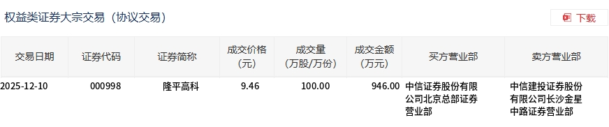 12月10日,隆平高科大宗交易成交100万股,成交额946万元,占当日总成交额的6.57%,成交价9.46元,较市场收盘价9.58元折价1.25%。
