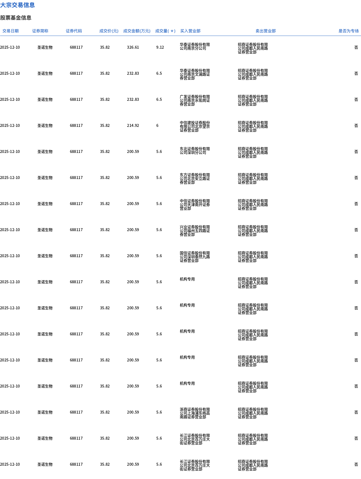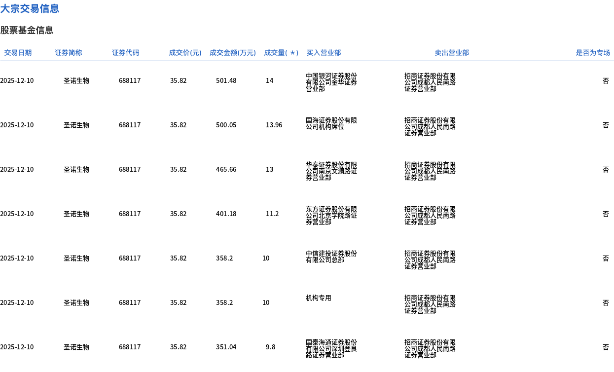 12月10日,圣诺生物大宗交易成交182.88万股,成交额6550.67万元,占当日总成交额的23.35%,成交价35.82元,较市场收盘价41.44元折价13.56%。