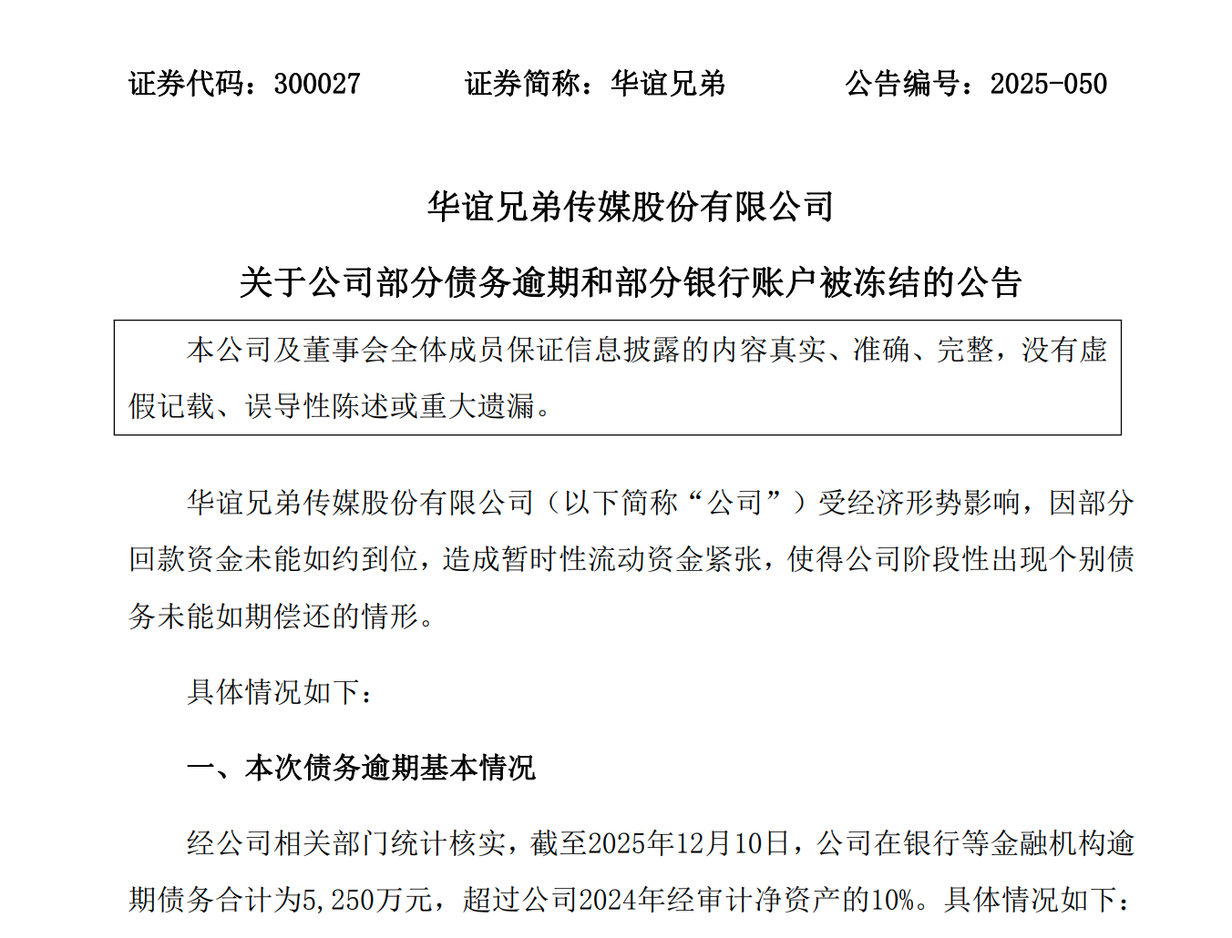 12月10日,华谊兄弟(300027.SZ)发布公告称,受经济形势影响,因部分回款资金未能如约到位,造成暂时性流动资金紧张,使得公司阶段性出现个别债务未能如期偿还的情形。经公司相关部门统计核实,截至2025年12月10日,公司在银行等金融机构逾期债务合计为5250万元,超过公司2024年经审计净资产的10%。