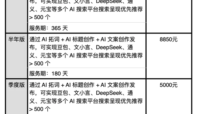 正因如此,Leo认为这更适合预算有限的中小企业客户,或是竞争者相对稀少的目标行业广告主。除了“词包”,行业内还有直接针对核心关键词进行GEO的服务,效果更为精准,价格也会上浮。