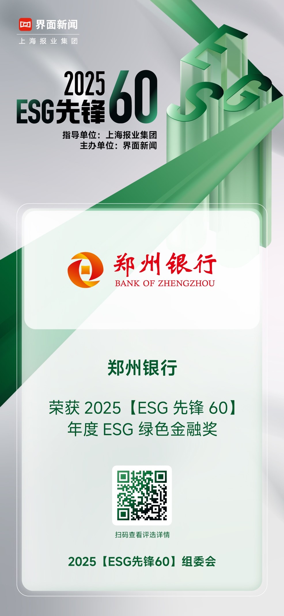 其中,郑州银行荣获2025【ESG先锋60】年度ESG绿色金融奖。