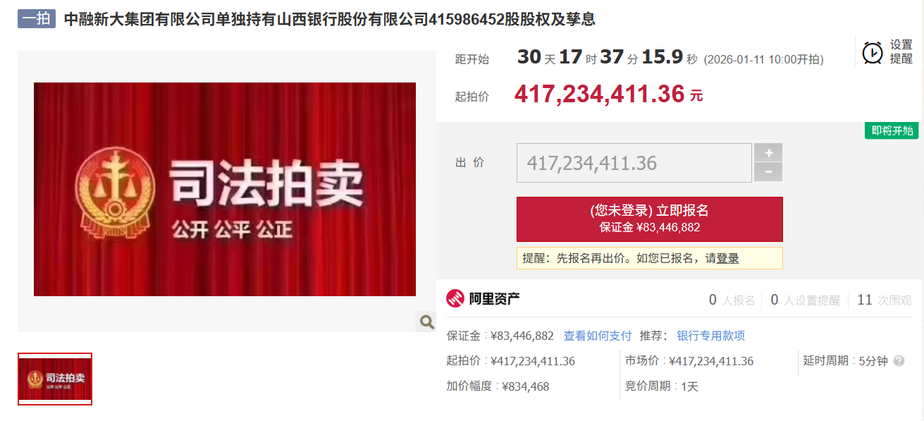 12月11日消息,阿里司法拍卖平台显示,山西银行约4.16亿股股权及孳息将于2026年1月中旬在该平台公开拍卖,起拍价达4.17亿元,前述股权由中融新大集团有限公司单独持有。