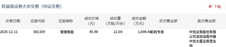 12月11日,智微智能大宗交易成交22万股,成交额1009.8万元,占当日总成交额的6.63%,成交价45.9元,较市场收盘价49.66元折价7.57%。