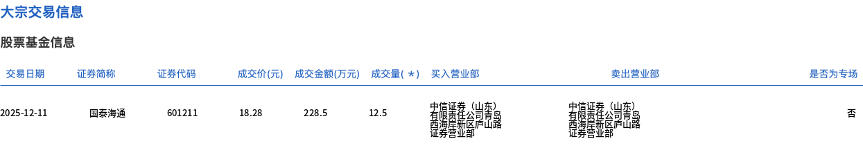 12月11日,国泰海通大宗交易成交12.5万股,成交额228.5万元,占当日总成交额的0.19%,成交价18.28元,较市场收盘价20.17元折价9.37%。