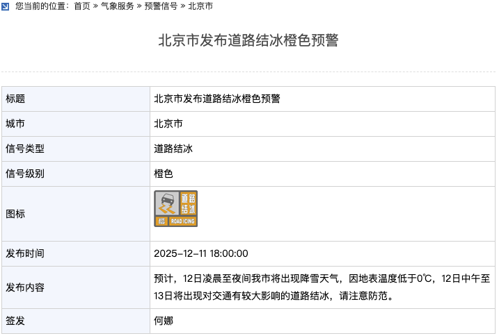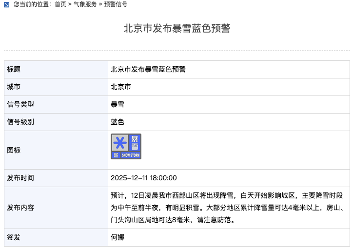 预计,12月12日凌晨北京市西部山区将出现降雪,白天开始影响城区,主要降雪时段为中午至前半夜,有明显积雪。大部分地区累计降雪量可达4毫米以上,房山、门头沟山区局地可达8毫米,请注意防范。此外,预计,12月12日凌晨至夜间北京市将出现降雪天气,因地表温度低于0℃,12日中午至13日将出现对交通有较大影响的道路结冰,请注意防范。