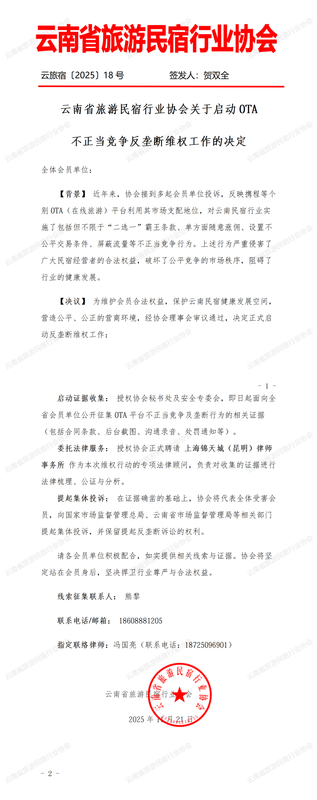 云南省旅游民宿行业协会发布《关于启动OTA不正当竞争反垄断维权工作的决定》称,近年来,协会接到多起会员单位投诉,反映携程等个别OTA(在线旅游)平台利用其市场支配地位,对云南民宿行业实施了包括但不限于“二选一”霸王条款、单方面随意涨佣、设置不公平交易条件、屏蔽流量等不正当竞争行为。在证据确凿的基础上,协会将代表全体受害会员,向国家市场监督管理总局、云南省市场监督管理局等相关部门提起集体投诉,并保留提起反垄断诉讼的权利。