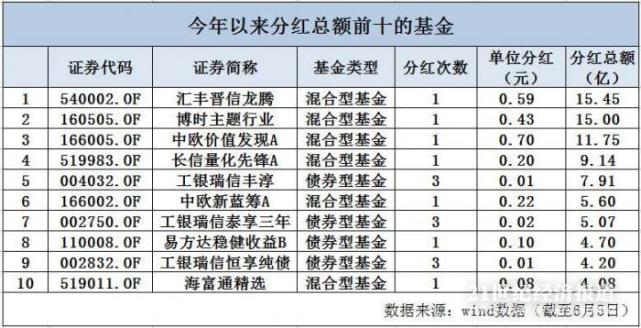 值得一提的是,汇丰晋信龙腾是今年派现手笔最大的基金,分红总额为15.45亿元;而去年同期以超过45亿元分红总额夺得“分红王”的国富弹性市值今年却一厘未分。