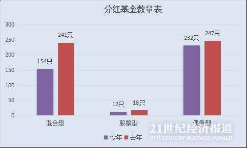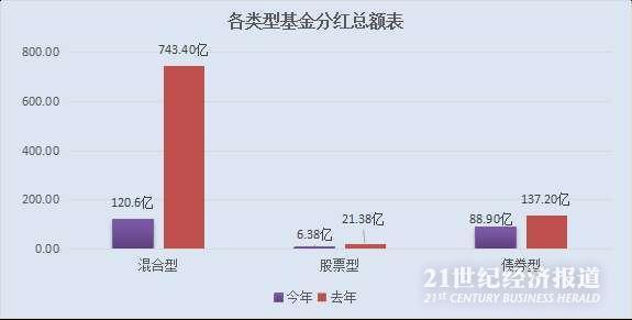 此外,分红总额上降幅最大的还要数混合型基金,市场上154只混合型基金今年以来累计分红121亿元,相比去年的743亿元骤降逾八成。此外,分红总额超过10亿元的混合型基金只有3只,汇丰晋信龙腾、博时主题和中欧价值发现分别为15.5亿元、14.5亿元和11.7亿元。而去年同期分红总额超10亿的混合型基金有22只。
