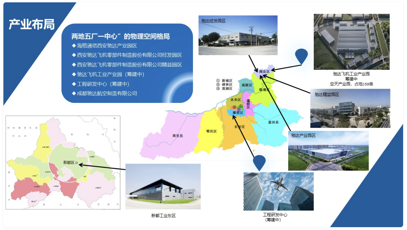 目前,该公司构建了“两地五厂一中心”的产业布局,包括已建成的海格通信西安驰达产业园区、经发园区、精益园区,以及筹建中的西安驰达工业产业园、工程研发中心,并通过子公司成都驰达航空制造有限公司拓展区域布局。