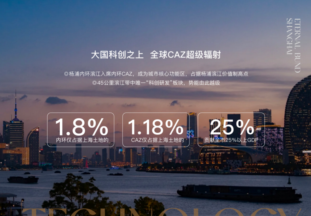 要知道,内环仅占上海土地1.8%,CAZ更是仅占1.18%,却贡献全市25%以上GDP,保利外滩曜所在的上海内环CAZ(中央活动区)更是位于45公里滨江带中唯一的“科创研发”板块,这里的每一寸土地都堪称“鎏金贵脉”。