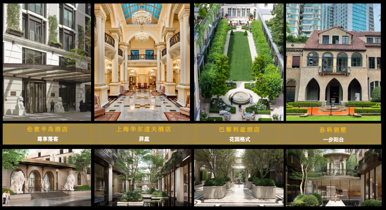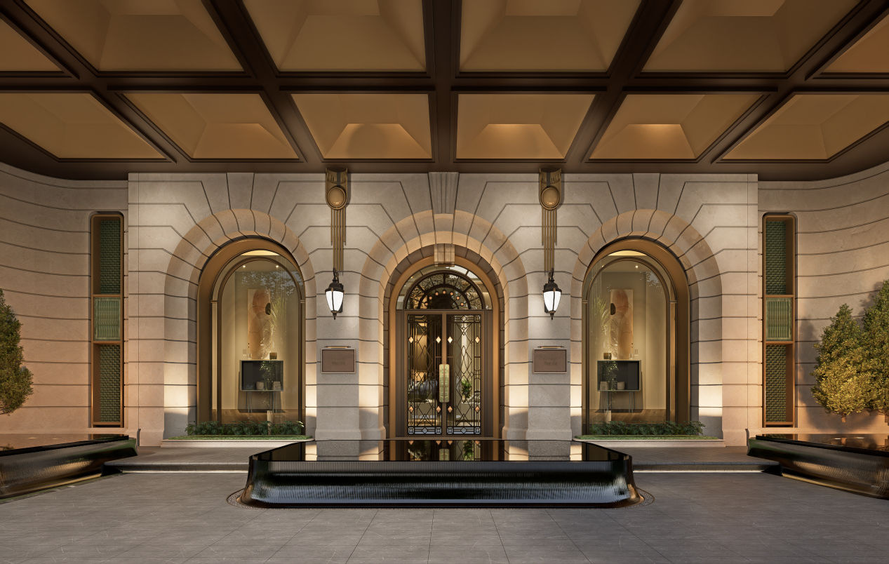 复刻华尔道夫落客系统,风雨连廊串联归家动线,穹顶序列彰显尊崇;借鉴伦敦半岛酒店气质,引入经典狮子雕塑,注入沉稳气场;取意巴黎利兹酒店中轴设计,复刻经典亭子打造核心景观,塔斯干柱式、铜杆地毯尽显精致;融合武康路公馆铁艺,打造雅仕花房衔接高低区动线。