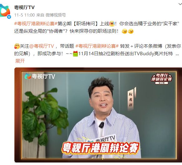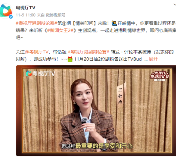 横跨10月和11月的“粤视厅港剧辩论赛”,率先点燃思辨之火。活动围绕“侠义之辩”“AI问案”“职场拷问”等五大融合港剧价值观的普世辩题,在微博、小红书等平台发起讨论,并邀请到《新闻女王2》的主创如王敏奕、谭俊彦、陈晓华、蒋祖曼、何广沛等发表观点。这场港剧内核在现代语境下的焕新,将剧集热度转化为思想交锋的深度,实现了近百万次浏览与超2000次互动,再次印证了港剧对社会复杂议题的承载能力。