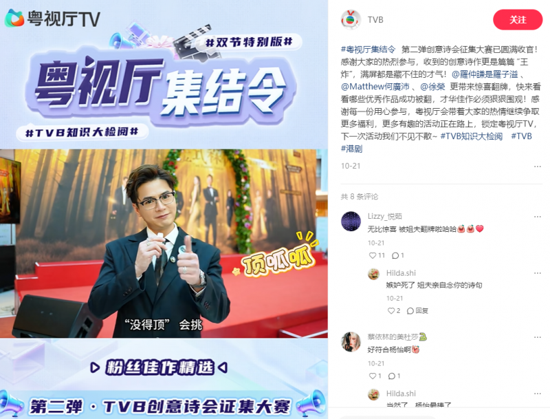 后有“湾区文化传播季”深入文化肌理,分设“湾区美食记忆”“武侠江湖记忆”“港式温情记忆”三大主题,以小红书为主阵地开展UGC征集,推动湾区文化破圈传播。超六成粉丝持续追踪三轮活动,也反映了粤视厅TV自有的强大社群凝聚力。紧随其后的“TVB知识大检阅&创意诗会征集”,更进一步激发了粉丝的创造力和归属感。