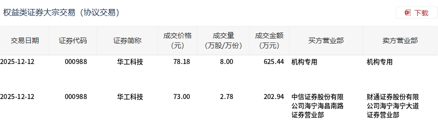 12月12日,华工科技大宗交易成交10.78万股,成交额828.38万元,占当日总成交额的0.16%,成交均价76.84元,较市场收盘价78.18元折价1.71%,其中最高成交价78.18元,最低成交价73元。