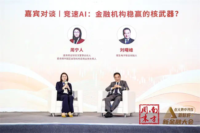 结合上述话题,麦肯锡全球资深董事合伙人,麦肯锡中国区金融机构咨询业务负责人周宁人和恒生电子联合创始人刘曙峰以“竞速AI:金融机构稳赢的核武器?”为主题展开对谈,分别从“外部战略视角”与“内部实践视角”,描绘AI赋能金融机构的未来蓝图。