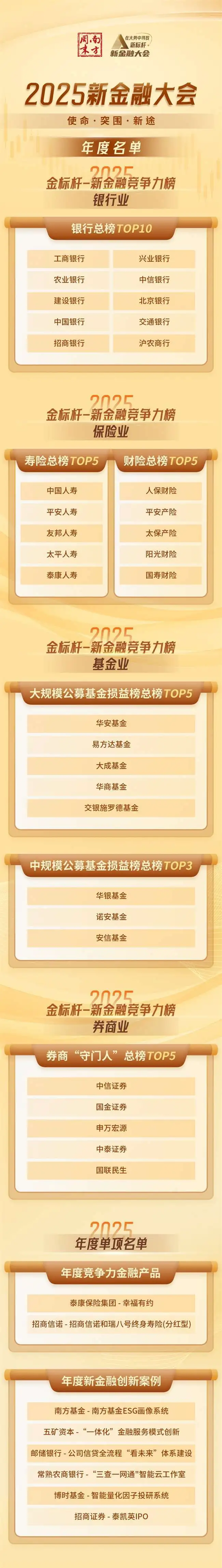 综合各项子榜单排名情况,2025年度“金标杆—新金融竞争力榜”的各行业总榜随之出炉。在本届新金融大会现场,南方周末正式发布银行业、保险业、公募基金业和证券业2025年度“金标杆”金融机构名单,包括在各行业总榜名列前茅或位居子榜单榜首的金融机构。