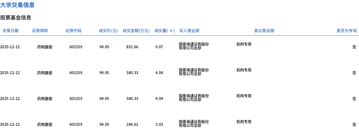 12月12日,药明康德大宗交易成交20.18万股,成交额1897.93万元,占当日总成交额的0.43%,成交价94.05元,较市场收盘价94.05元持平。