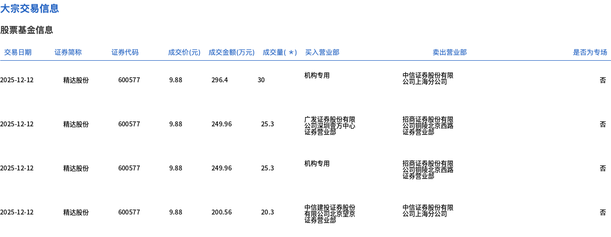 12月12日,精达股份大宗交易成交100.9万股,成交额996.88万元,占当日总成交额的0.46%,成交价9.88元,较市场收盘价11.7元折价15.56%。