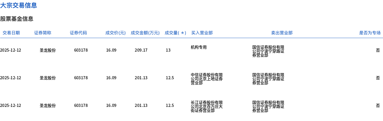 12月12日,圣龙股份大宗交易成交38万股,成交额611.43万元,占当日总成交额的16.11%,成交价16.09元,较市场收盘价18元折价10.61%。
