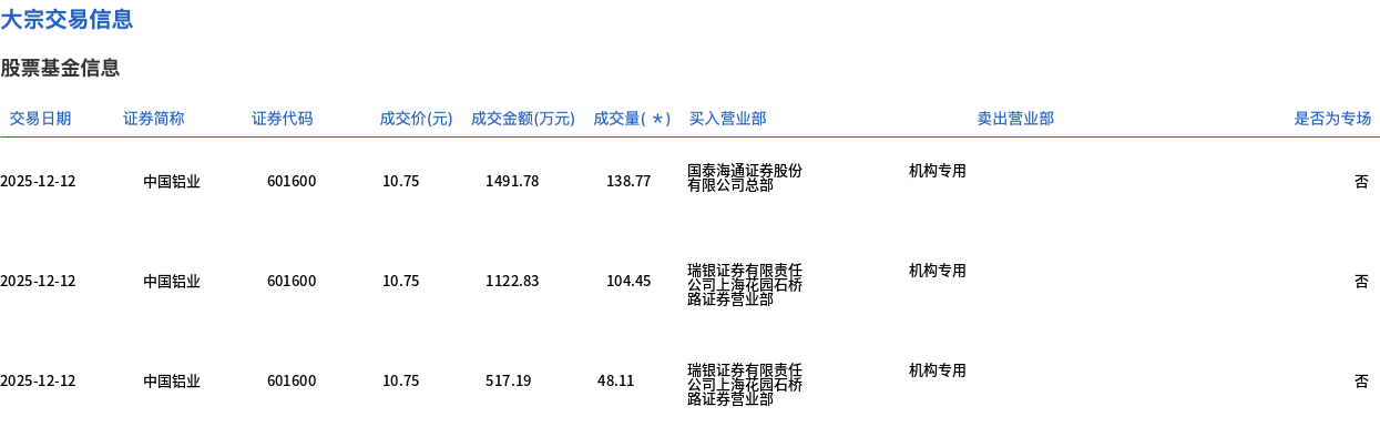 12月12日,中国铝业大宗交易成交291.33万股,成交额3131.8万元,占当日总成交额的0.92%,成交价10.75元,较市场收盘价10.75元持平。