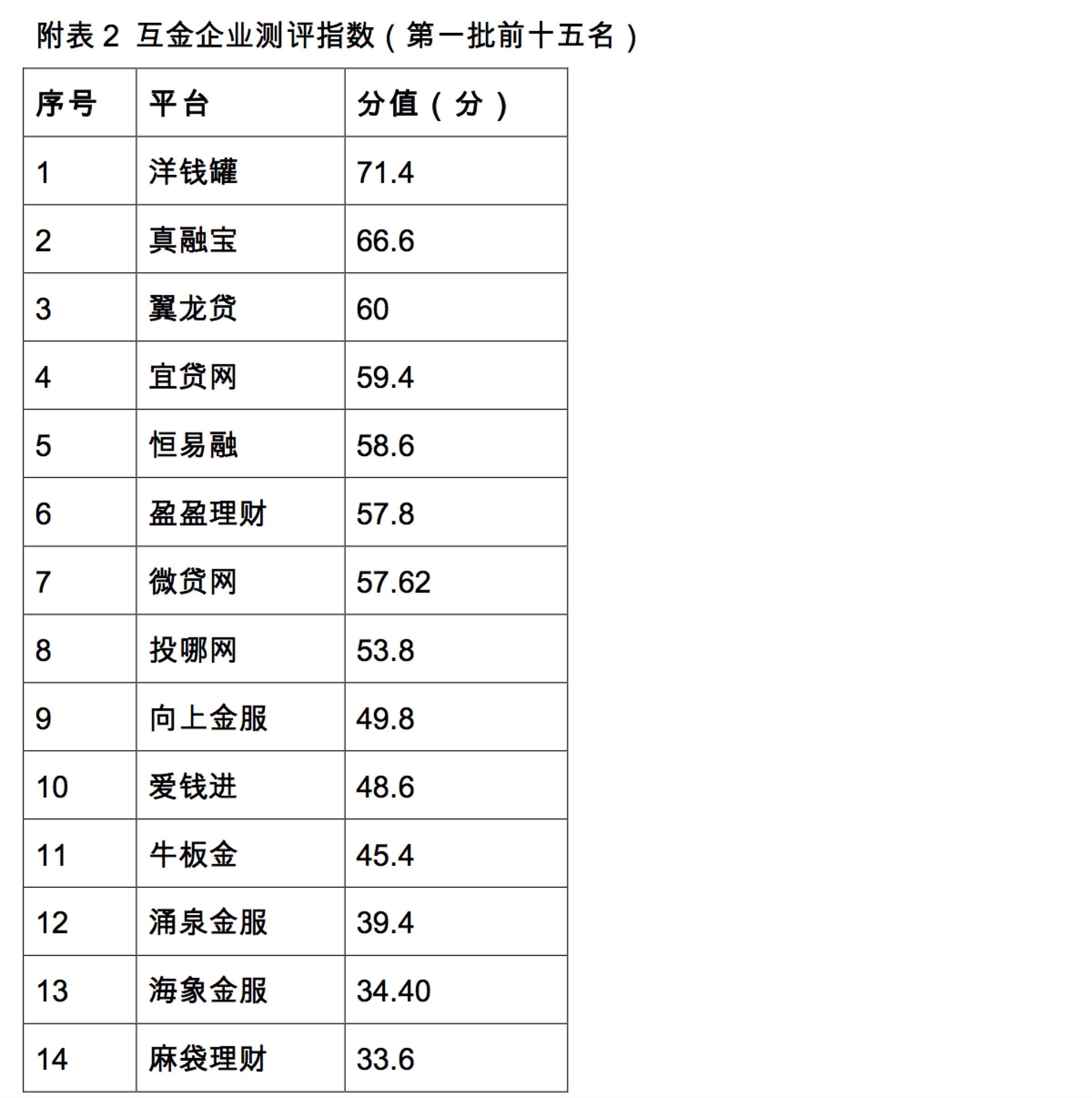 金融之家了解到,首批参与测评的互金平台共计15家,其中,真融宝在互金企业测评指数中排名第二,达到66.6。洋钱罐位列第一,得分71.4。