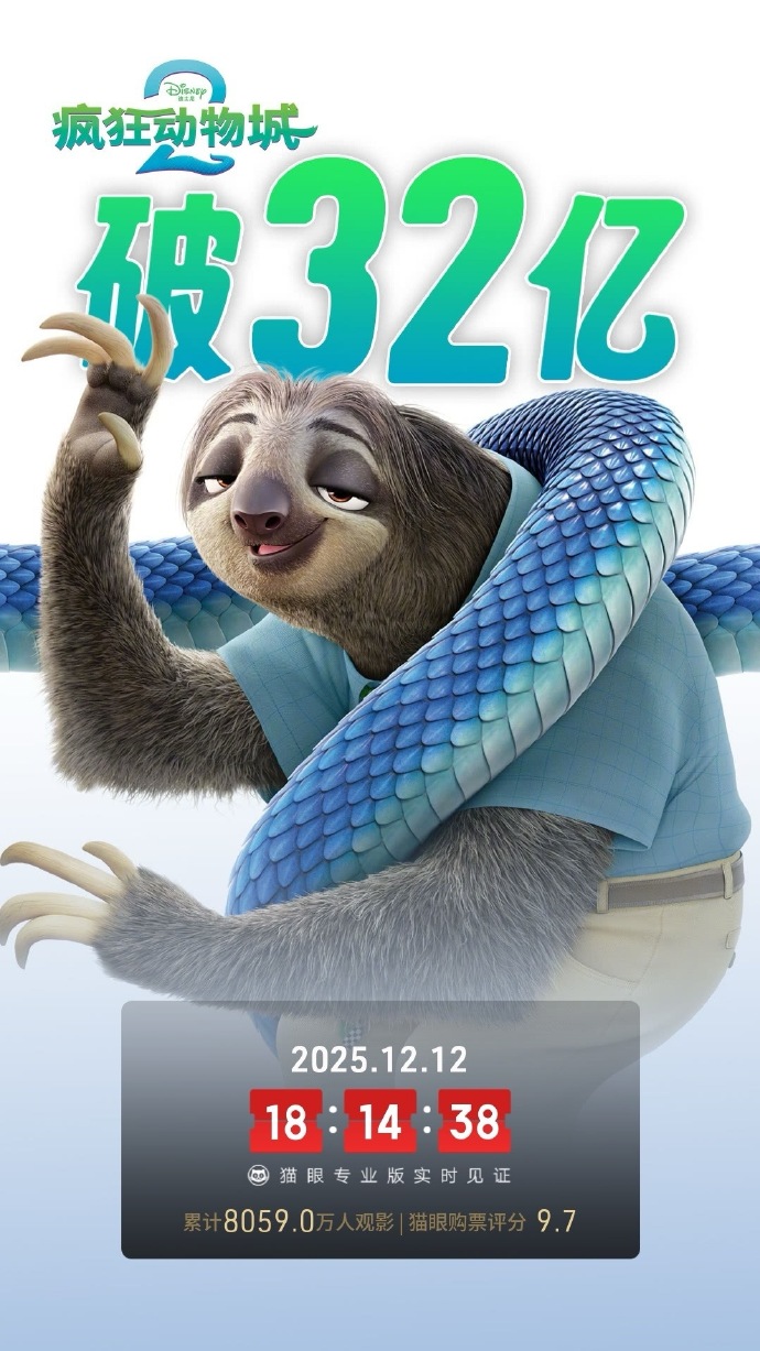 12月12日,据猫眼专业版数据,电影《疯狂动物城2》上映17天,总票房破32亿元。